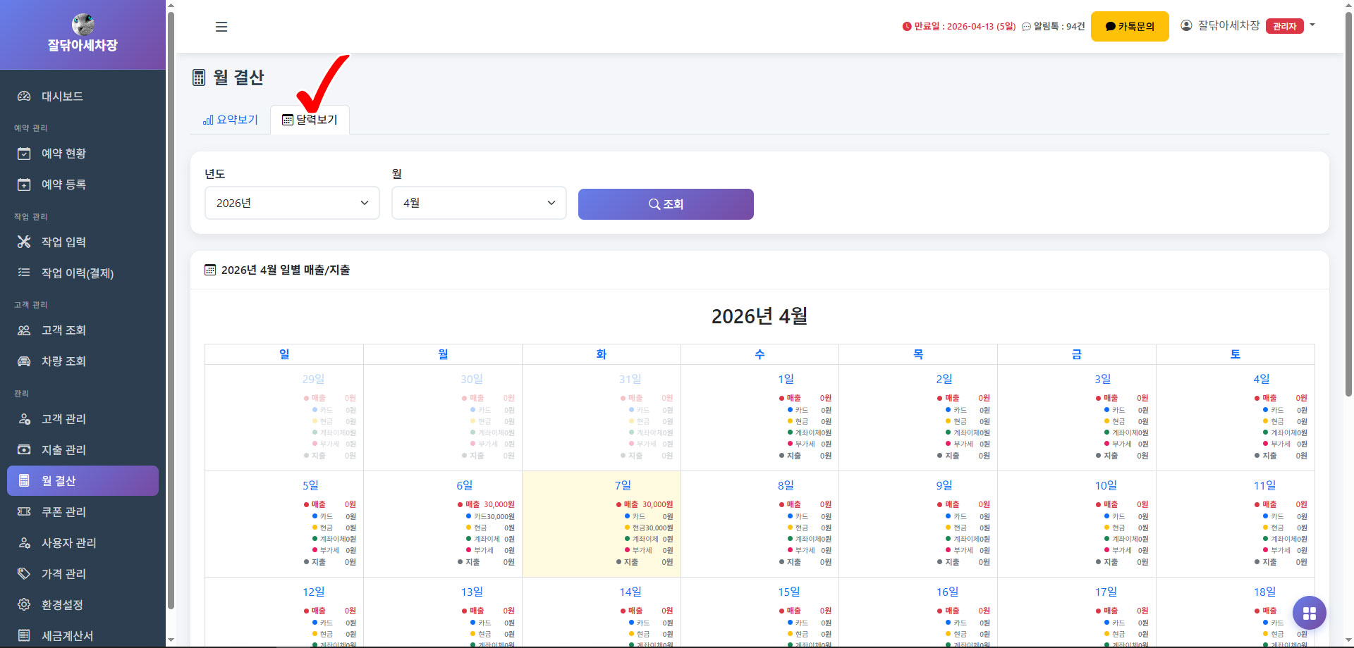 메뉴명 : 월결산 > 달력보기