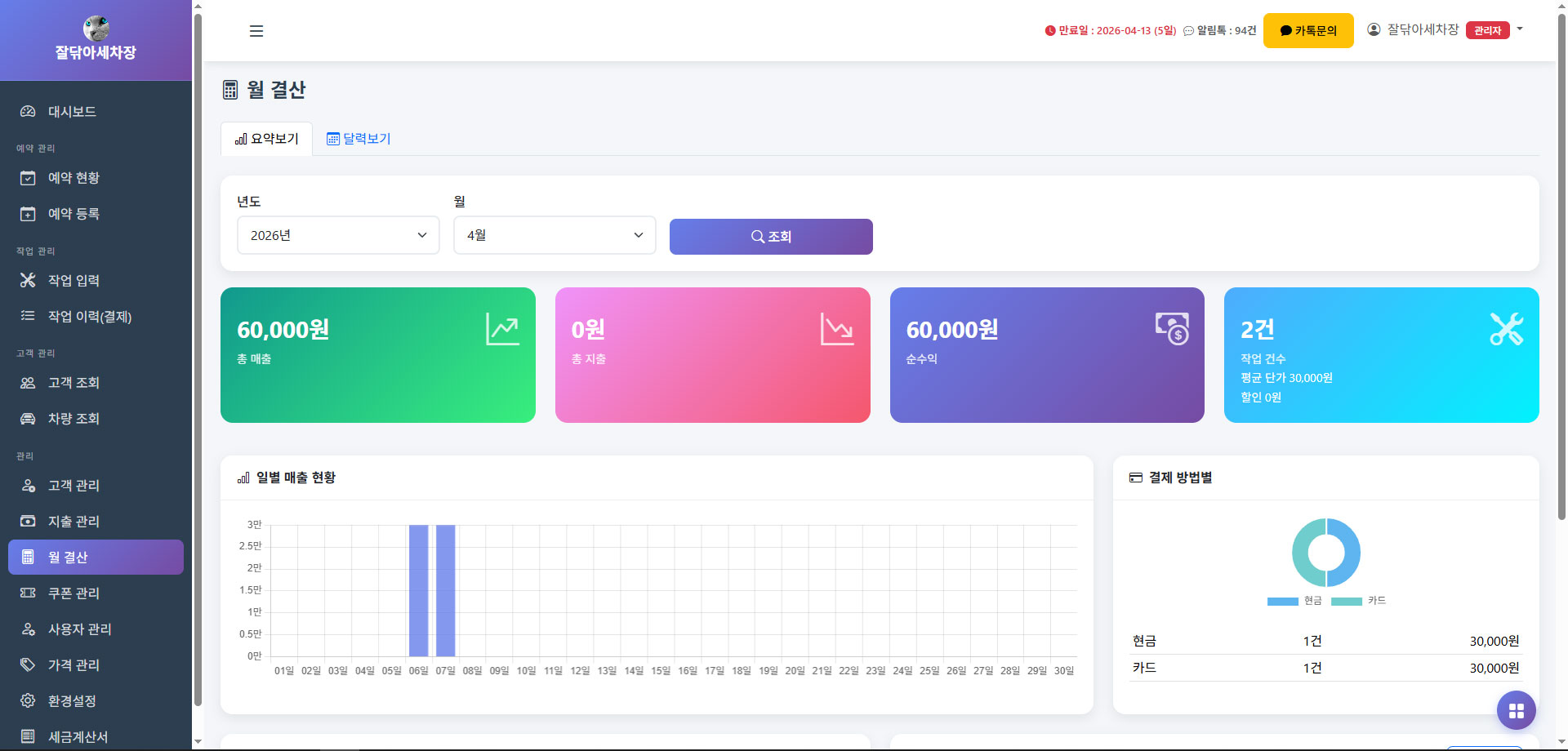 월 기준 매출, 지출, 작업 건수, 일별 매출 현황을 한눈에 확인할 수 있습니다.