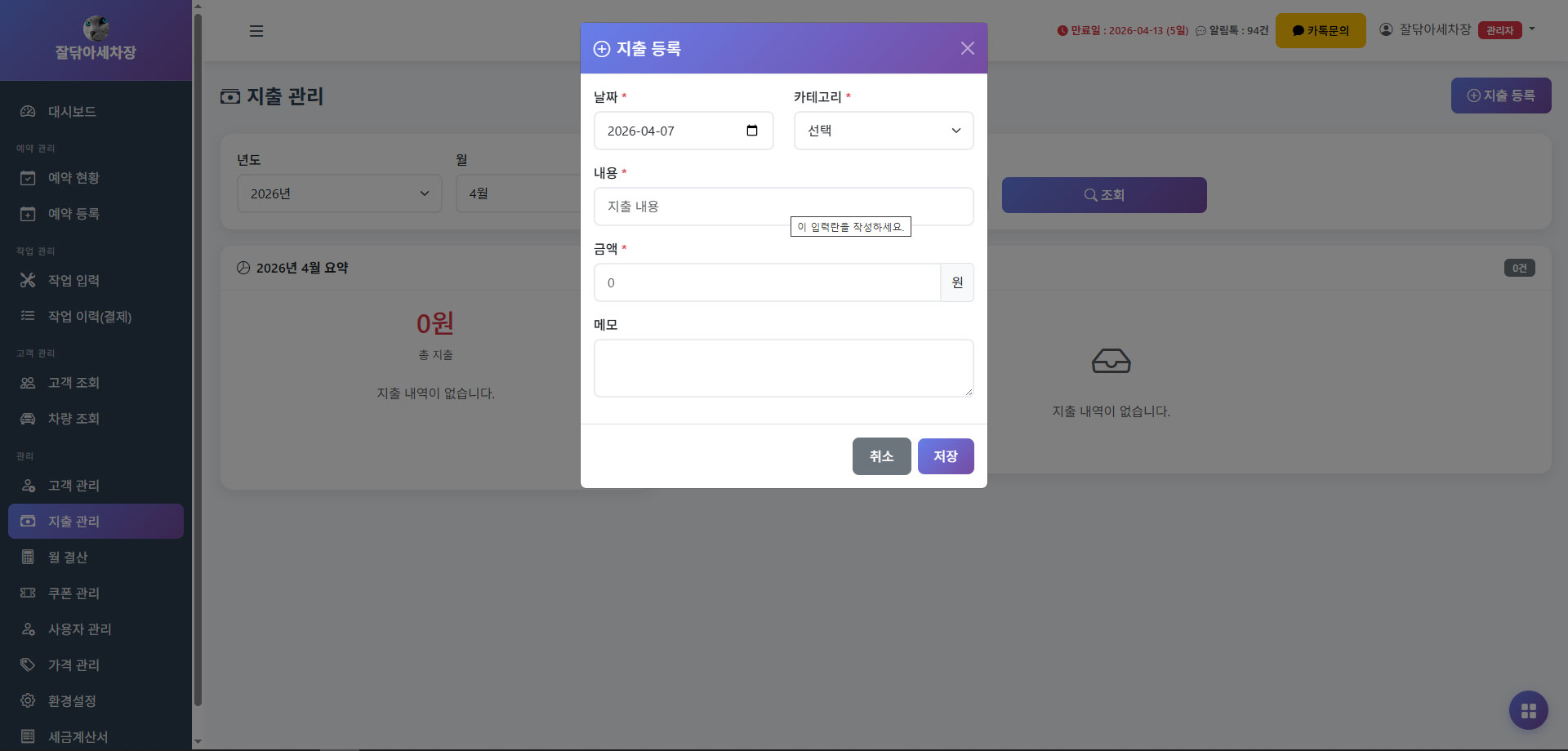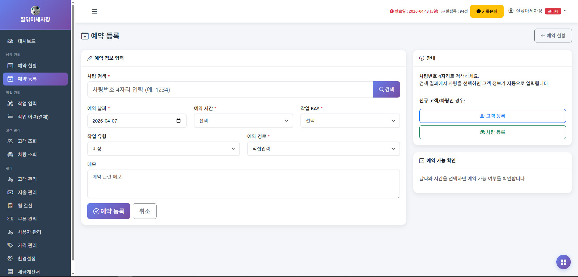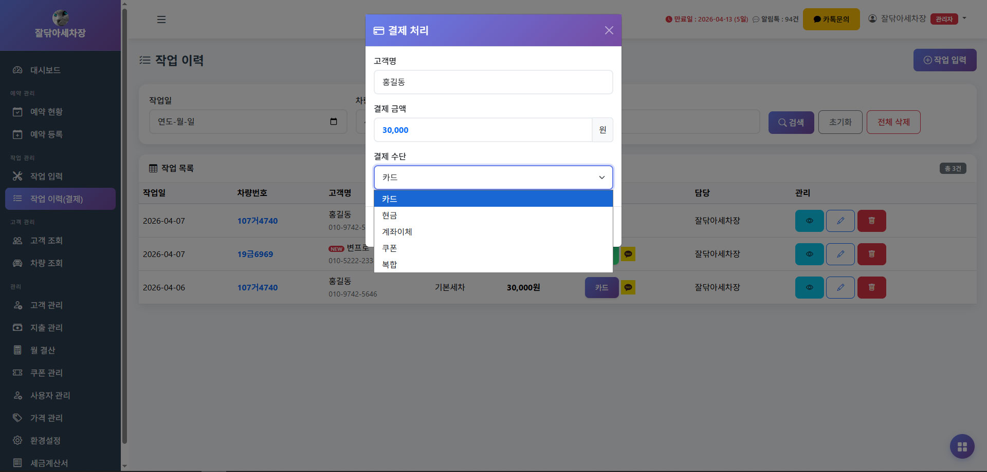 고객 조회부터 가격 관리, 작업 입력, 결제, 월결산, 쿠폰, 예약 등록까지 주요 기능을 한눈에 확인할 수 있습니다.