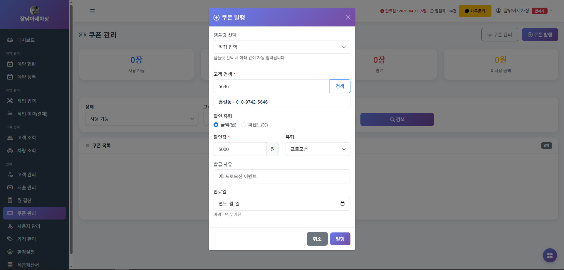자주 사용하는 쿠폰을 등록하고, 개별 쿠폰 발행 기능도 이용할 수 있습니다.