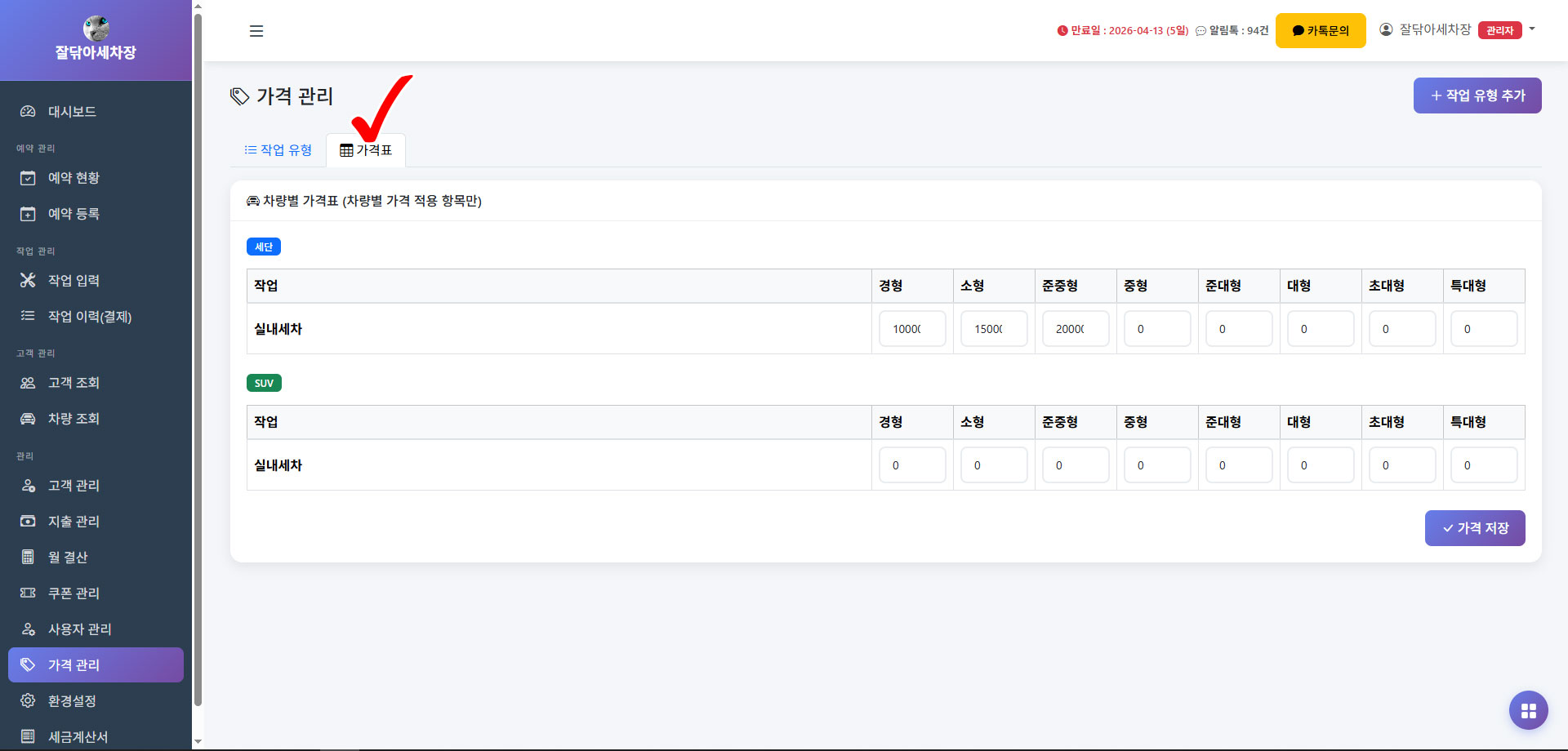가격유형을 차량별가격으로 등록한 경우 차 크기별로 금액을 입력할 수 있습니다.